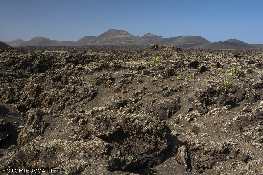 Pola lawy wokół El Cuervo, w dali wulkany w parku Timanfaya