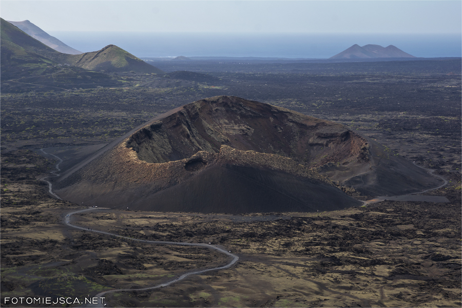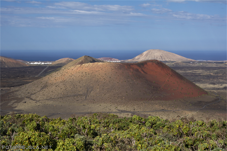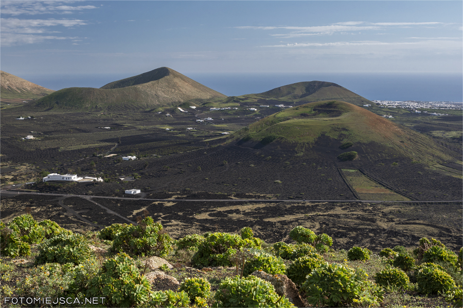 Widok na południe - wulkany Montana Blanca, Montana Tesa i Montana Testeina z czarnymi polami winnic