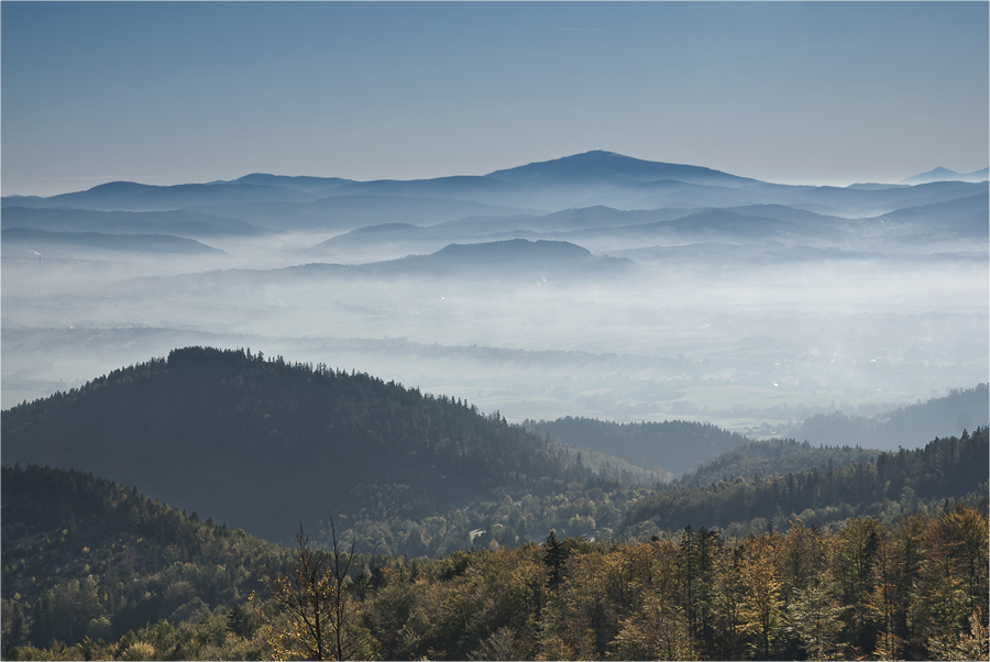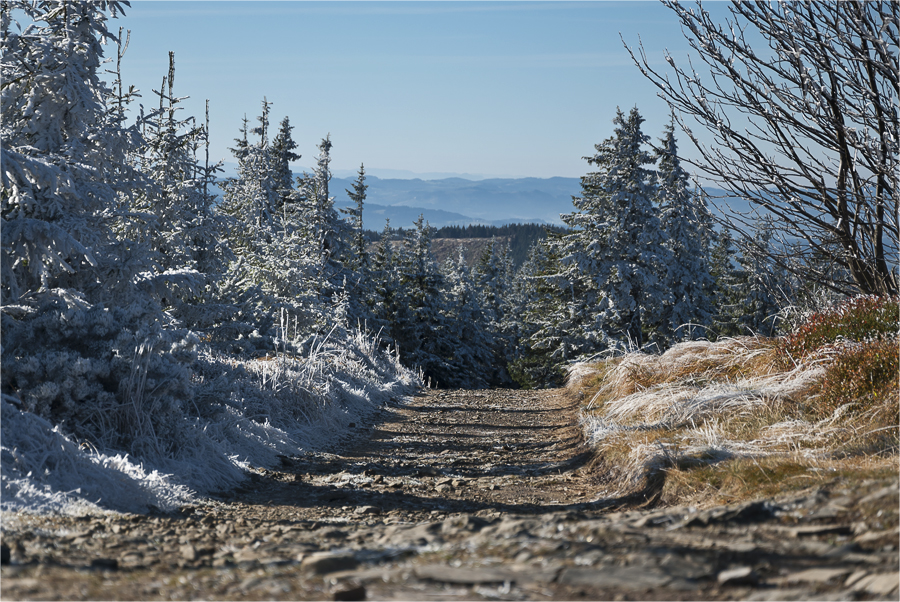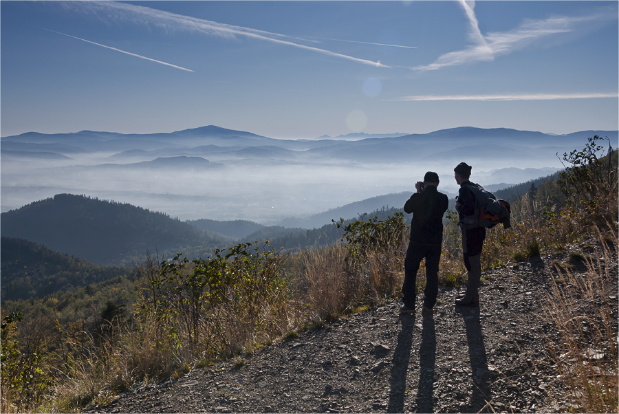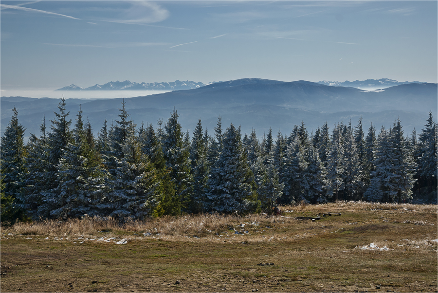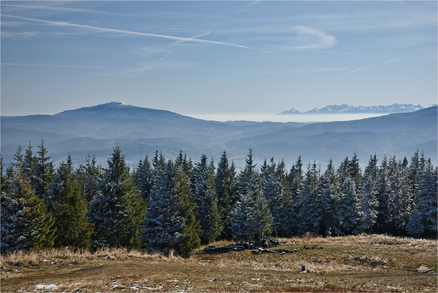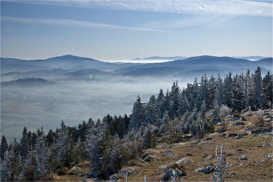 Kiedy zajeżdżamy na parking Szczyrk jeszcze śpi. Ruszamy zielonym szlakiem, który początkowo wiedzie przez las. Jest bardzo zimno ale na podejściu szybko się rozgrzewamy. W pewnym momencie docieramy do miejsca, gdzie jest spory ubytek drzew, przez co oglądamy wspaniałą górską panoramę. Dzięki inwersji widoczność jest super, doskonale prezentują się beskidzkie pasma oraz królowa Beskidów Babia Góra (1725 m n.p.m.), dalej Pilsko (1557 m n.p.m.) a między nimi Tatry.