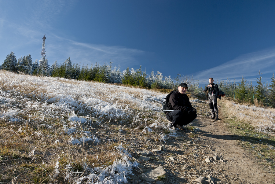Kręcimy się chwilę po szczycie, ja hasam sobie z aparatem i łapię co ciekawsze kadry. Zmrożone drzewa wyglądają wspaniale. Trzeba korzystać póki słońce nie zniszczy tego dzieła.
