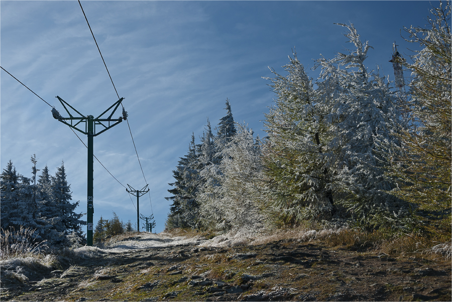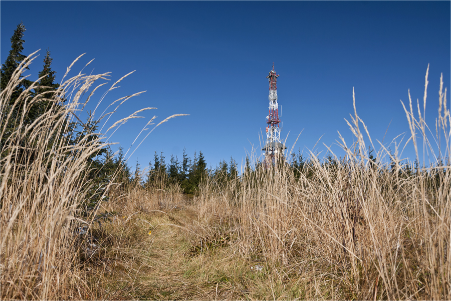 Kiedy dochodzimy na polanę pod Skrzycznem widać już wieżę nadawczą. Jeszcze kawałek i będziemy na szczycie. Trawy i drzewa są malowniczo zmrożone, czujemy się jak w bajkowej krainie. Niebo jest błękitne a na nim tylko delikatne pasy chmur i słońce.