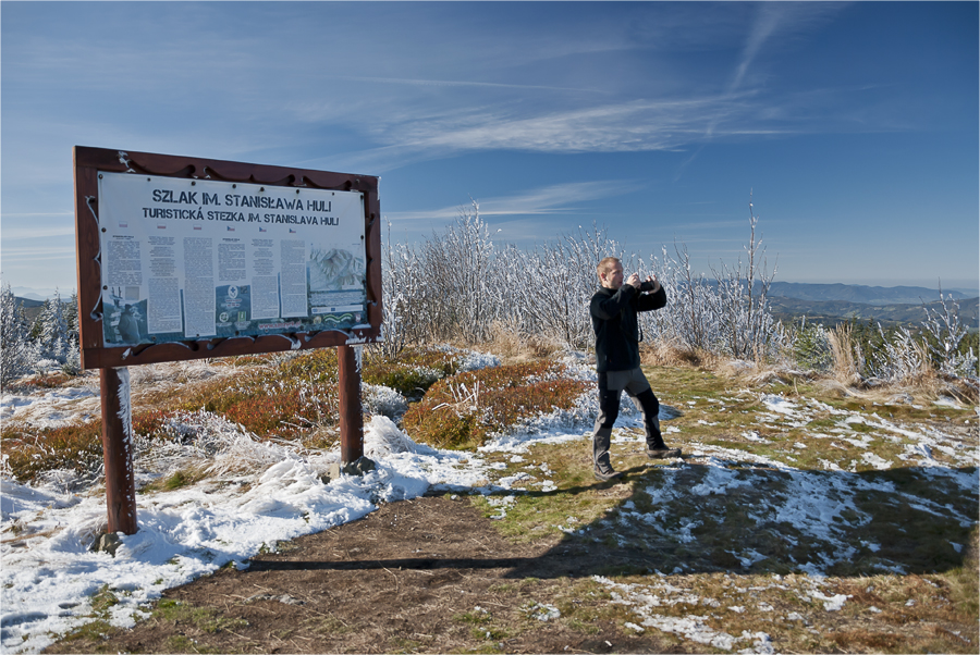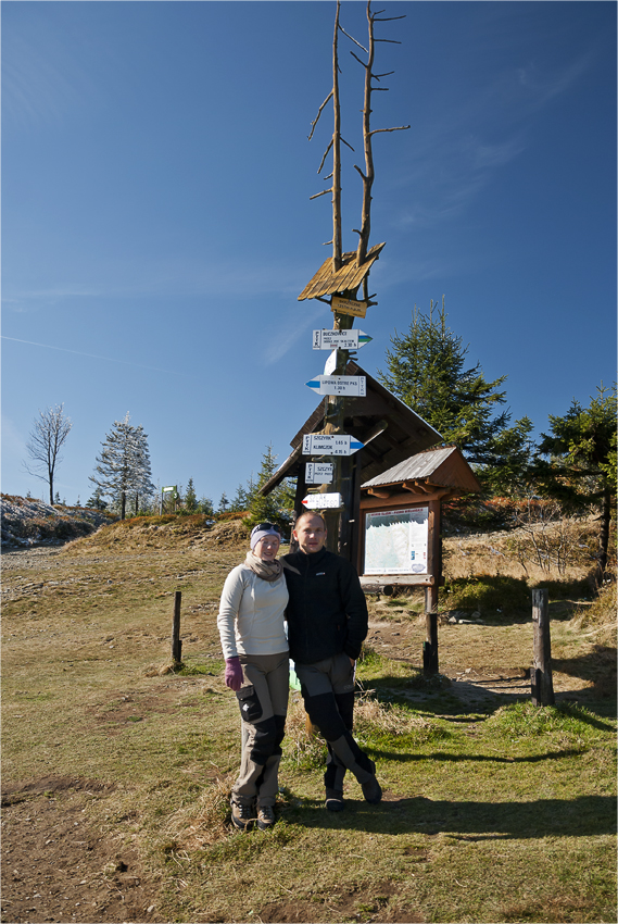 Robię jeszcze kilka zdjęć w stronę Tatr, po jednym pamiątkowym pod tabliczką szczytową i ruszamy w dół.