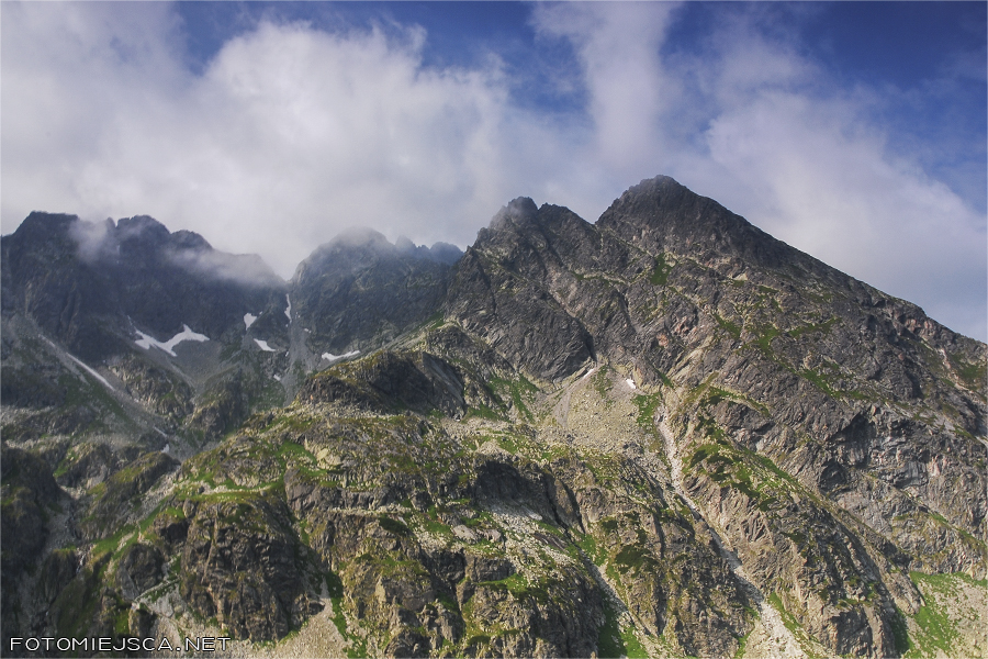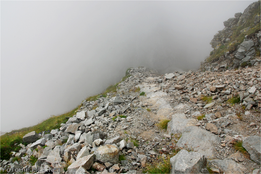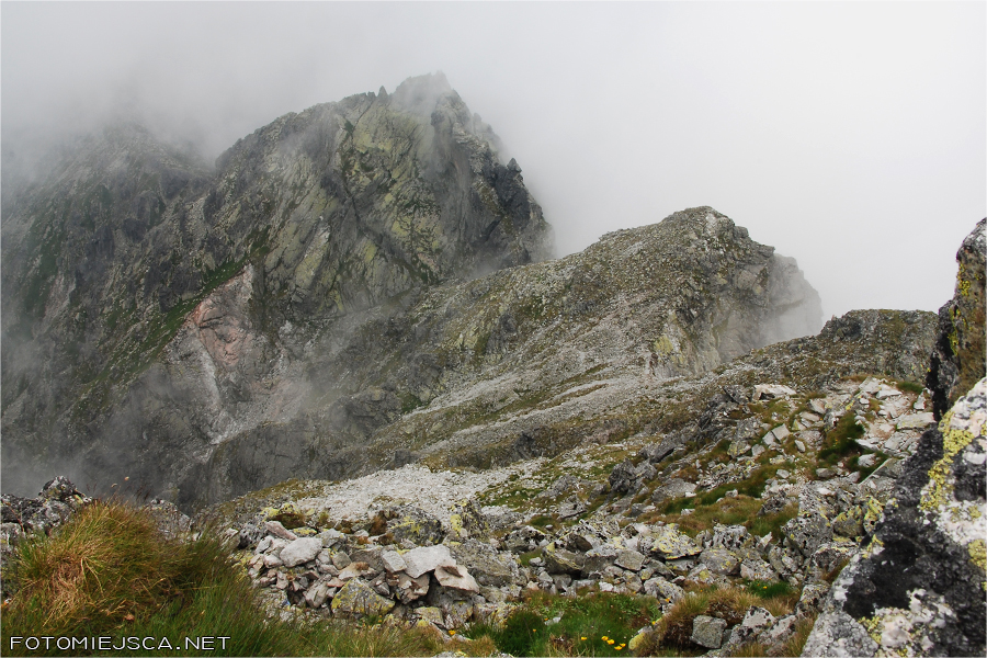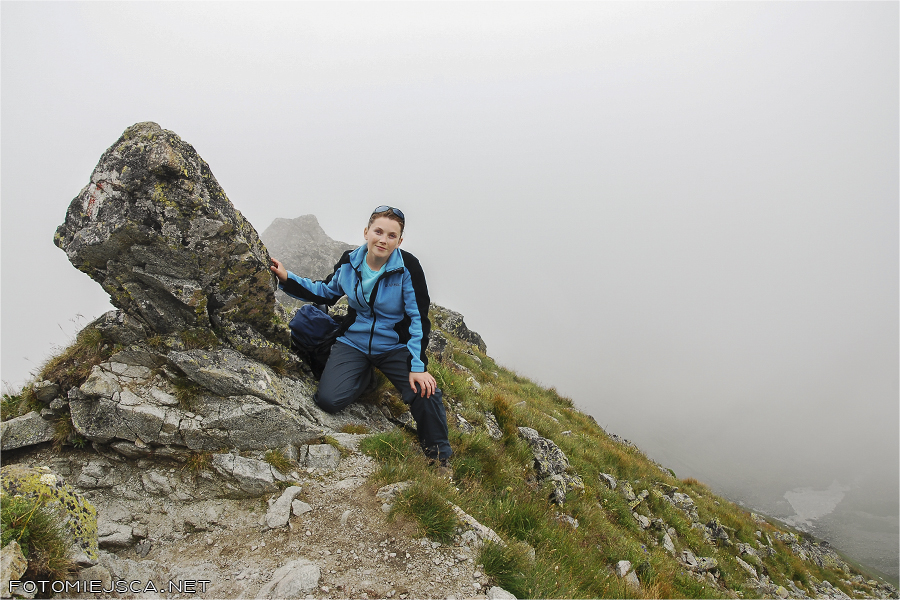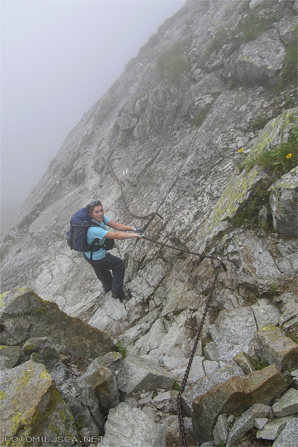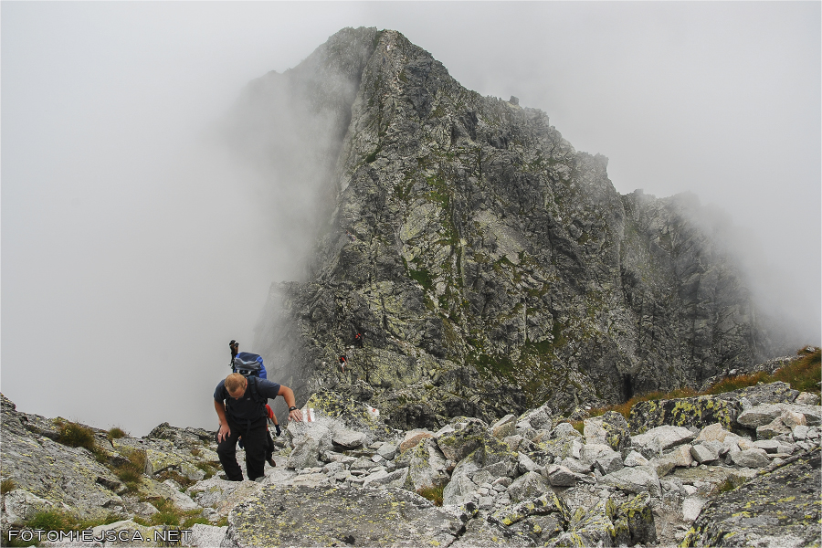 Kiedy dochodzimy do szczytu znajdujemy się w chmurach, które co jakiś czas odpływają i ponownie osiadają na grani. Nie widać niczego co jest w dole. Jakiś czas z nadzieją czekamy na przejaśnienia, w końcu kończy się nam cierpliwość, zwijamy swoje rzeczy i ruszamy na najciekawszą część szlaku.