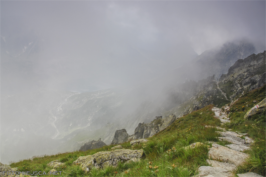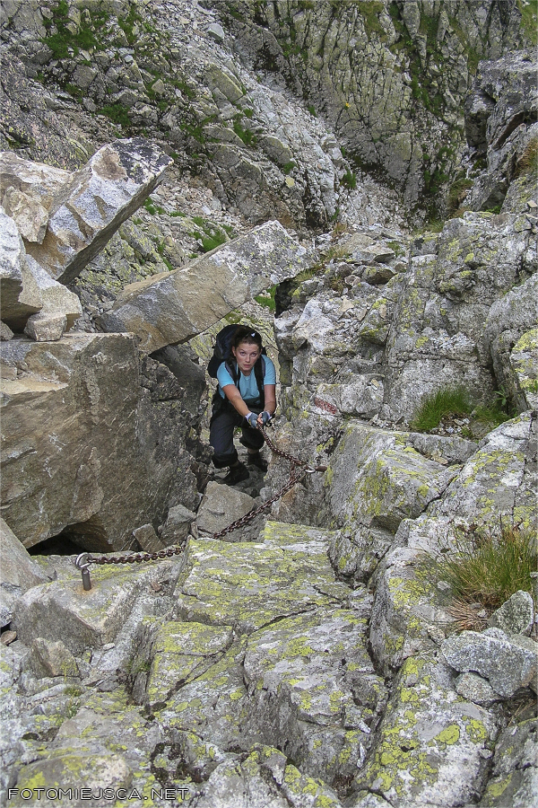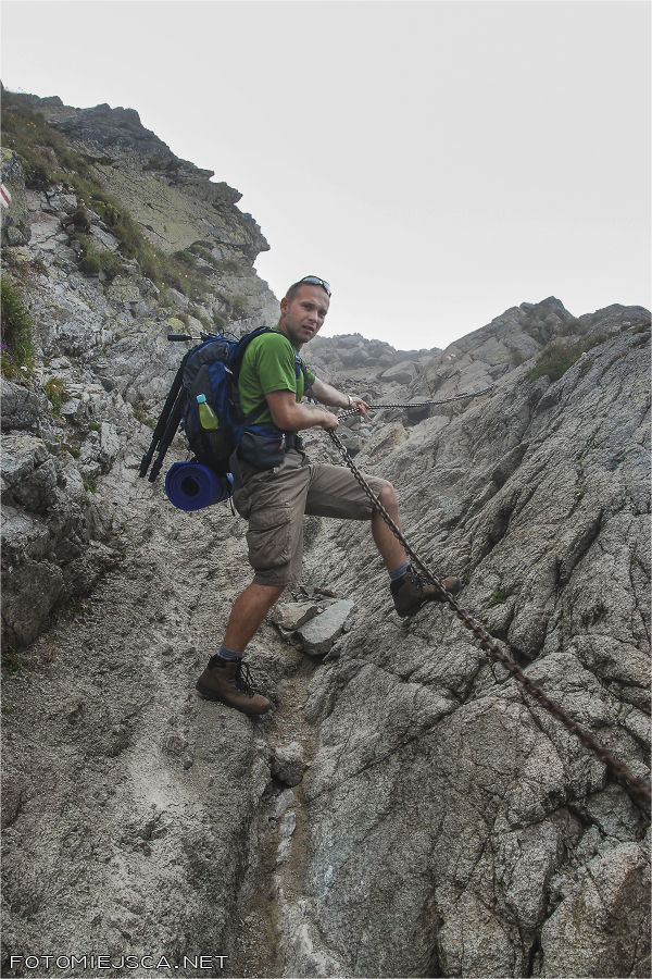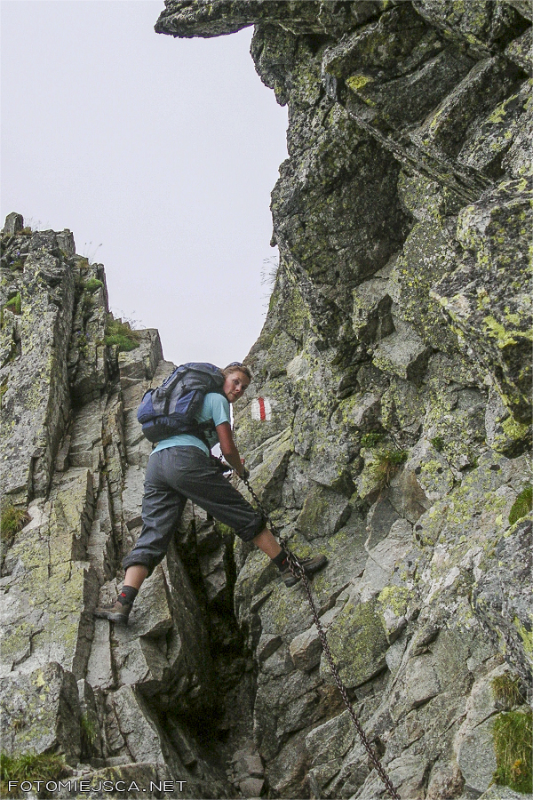 Szlak od Skrajnego Granatu w stronę Przełęczy Krzyżne serwuje nam rozmaitości, od spokojnych ścieżek między turniami, przez skalne partie zaopatrzone w łańcuchy i drabinki, a na lufiastych miejscach skończywszy. Pierwszy raz mamy okazję być w takim terenie i to w chmurach. Sama nie wiem czy ograniczona widoczność pomaga czy utrudnia sprawę.