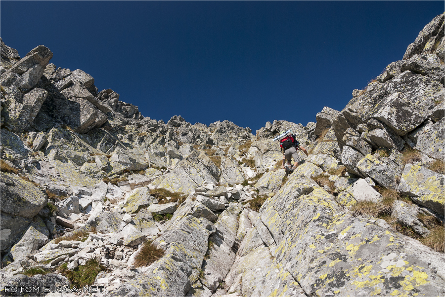 Do żlebu prowadzącego na Huncowską Przełęcz idzie się fajnie ale już w samym żlebie jest do bani. Kamienie uciekają spod nóg, niestety po niefortunnym kroku zaliczam upadek i boleśnie obijam piszczele oraz rękę. Jako fotograf bardziej niż o siebie martwię się o swój sprzęt, który na szczęście wychodzi bez szwanku.
