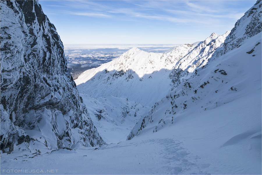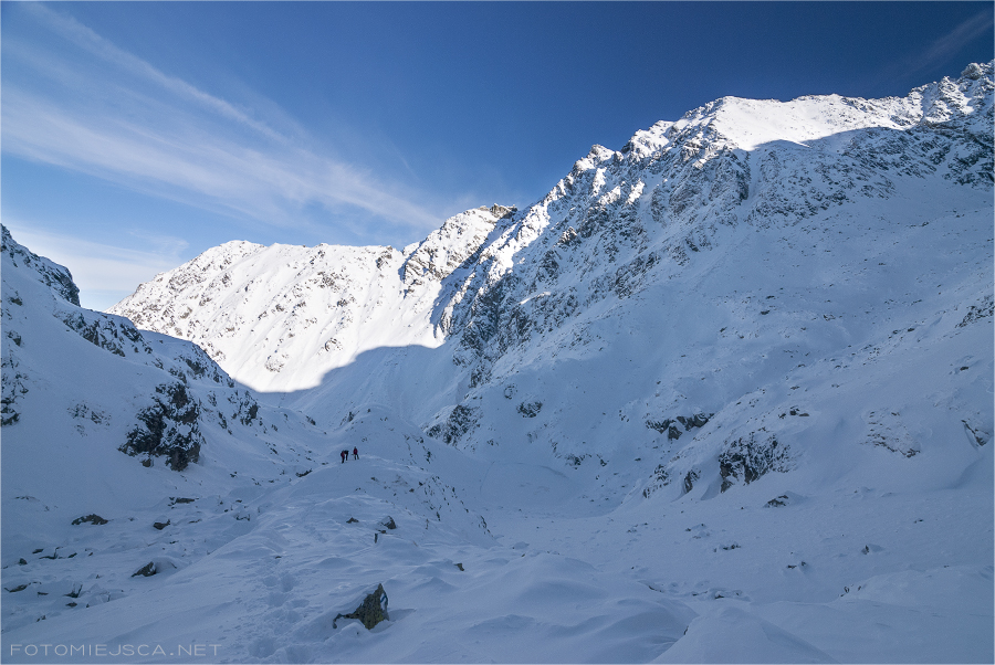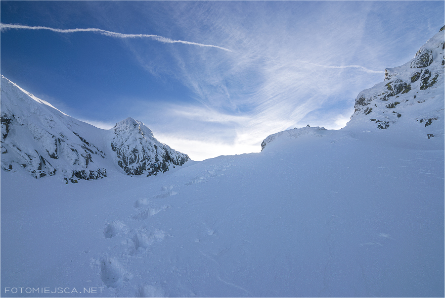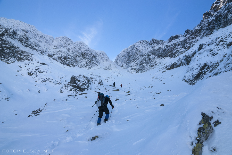 Zejście z Zawratu podnosi nam trochę ciśnienie, śnieg wysuwa się spod nóg i nie trudno ujechać. Cały czas mam na myśli to, że jest teraz lawinowa dwójka i wszystko może się zdarzyć. Lekko uspokajająco działa fakt, że ściska mróz więc pokrywa powinna nas utrzymać.