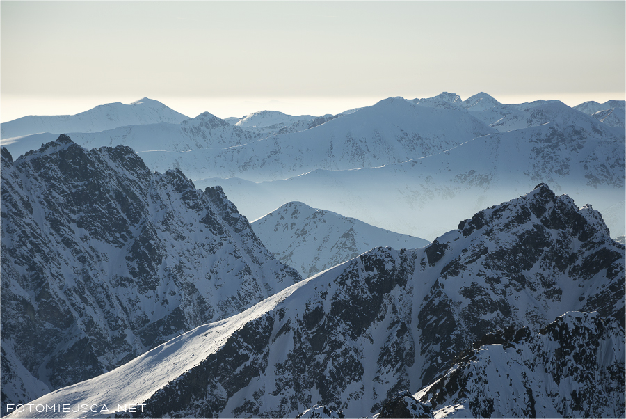 Zbliżenie na Orlą Perć, a dokładnie Kozi Wierch i Granaty. Na pierwszym planie fragment Miedzianego a na tyłach Babia i Pasmo Policy we mgłach