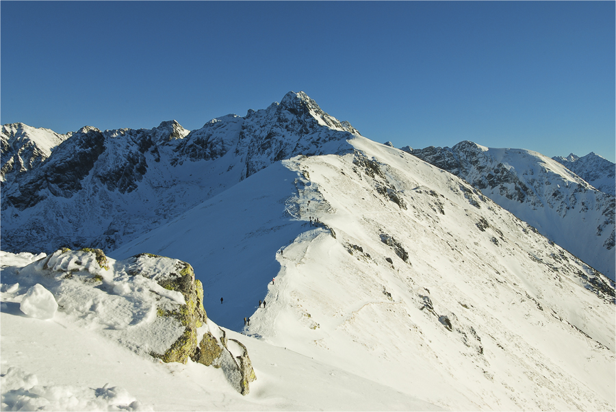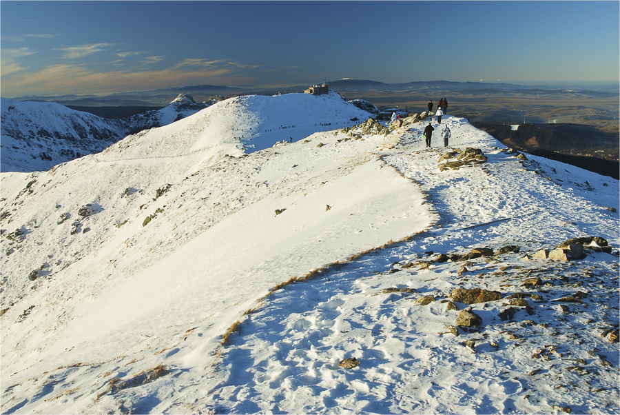 Mozolnie pniemy się coraz wyżej i nie możemy napatrzeć się na otoczenie. W końcu pokonujemy ostatni zakos i wychodzimy na grań tuż obok górnej stacji kolejki. Jeszcze kilka chwil w górę i zdobywamy wierzchołek Kasprowego. Tutaj zaczyna się kolejna uczta dla oczu, bo dodatkowo widać Tatry Zachodnie oraz Beskidy.