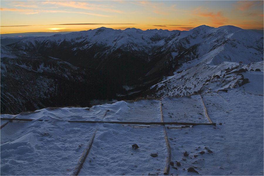 Kiedy słońce styka się z horyzontem mija moment i znika. Na niebie pozostaje tylko kolorowa poświata kontrastująca z białymi szczytami i ciemnymi dolinami.